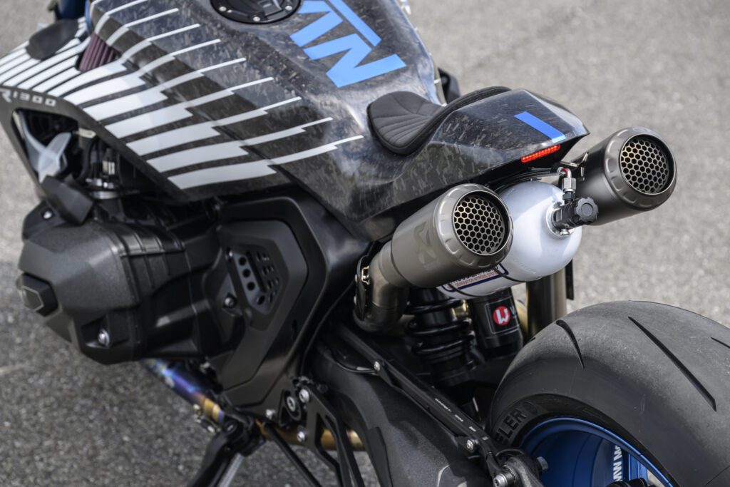 Power comes from the same 1300cc boxer engine, now aided by a button-activated nitrous oxide system. The custom-built titanium Akrapovic exhaust system, developed in collaboration with the brand, enhances the bike’s roar while accentuating its racy silhouette.
