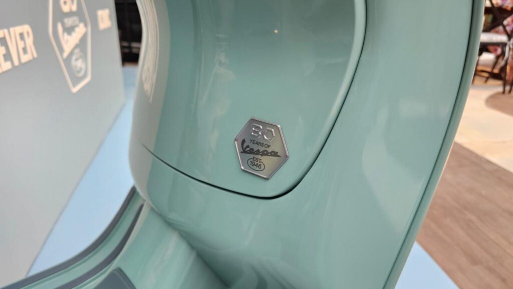 Special badging further sets it apart, with an ‘80th’ emblem on the front apron and an ‘80 years of Vespa Est. 1946’ insignia at the rear.